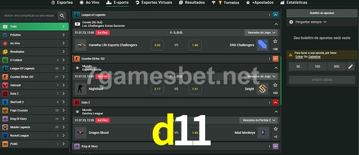 O d11 oferece uma grande seleção de opções de apostas em e-sports com probabilidades competitivas